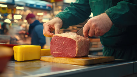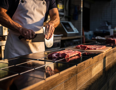 A skilled butcher expertly cuts meats at a bustling market, showcasing fresh selections from local producers. Generative AI