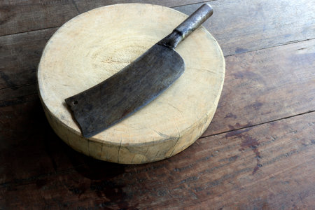 big ancient cleaver ready to be used again, on top of an old wooden cutting board with copy space
