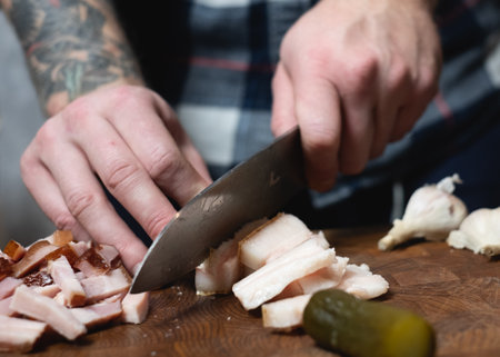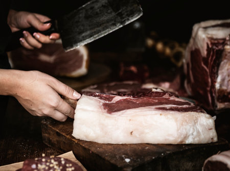 slicing raw meat, bacon, pork, cooking meat. Butchering pork, beef. Cutting fresh meat