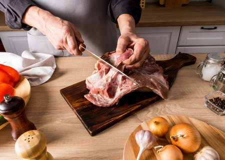 the butcher's hands cut a large piece of raw meat on a wooden board with a sharp knife. the concept of cooking food at home