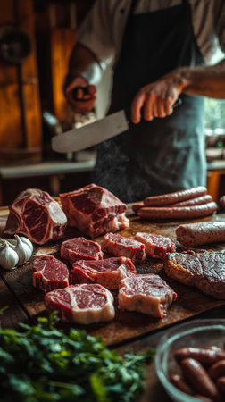 Chef slicing raw lamb and sausage on a wooden table surrounded by fresh ingredients. Perfect for carnivore diets.