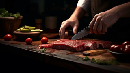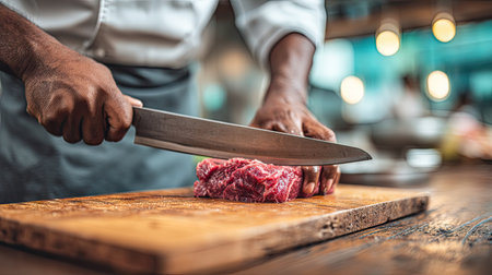A skilled chef is skillfully slicing fresh meat on a wooden cutting board in a contemporary kitchen, showcasing culinary expertise and fresh ingredients.