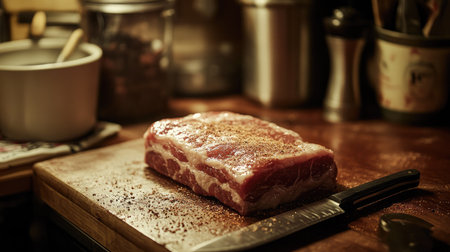 Raw pork belly on a counter, with crispy crackling seasoning and a knife placed nearby.