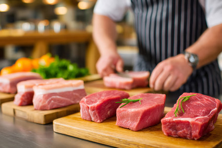 Butcher cutting and preparing different cuts of fresh red meat on wooden chopping boards in a professional kitchen