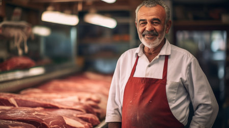 Cheerful butcher smiling warmly behind the meat counter at a bustling grocery store market