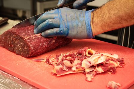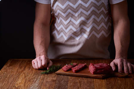 chef cuts raw meat with a knife on a board, Cook cuts raw meat