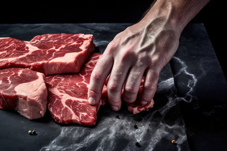 A skilled chef prepares raw meat with expert seasoning for a gastronomic feast, evoking a sense of culinary dedication.