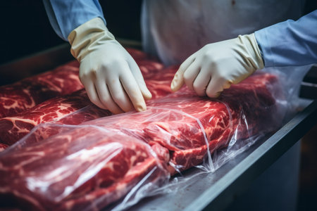 Capture the skilled hands of a meat factory worker as they expertly pack fresh meat into plastic foil using a specialized machine. This image showcases the precision and dedication involved in the meat processing industry