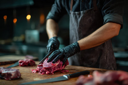 Butcher wearing black gloves skillfully cuts fresh meat in a dimly lit kitchen during an afternoon prep session