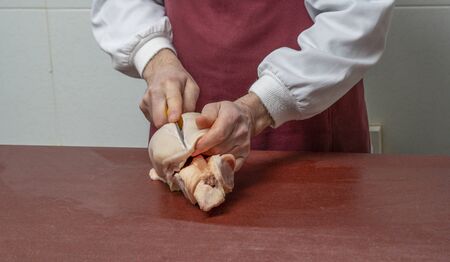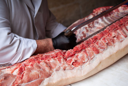 Butcher cutting raw pork meat.