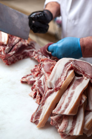 butcher that cuts fresh pork in meat industry