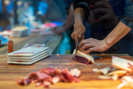 deliscious fresh parma serrano ham slices pork gourmet jamon on market