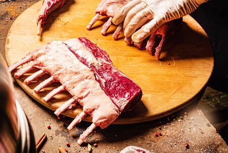 Butcher shop. Fresh cuts, raw beef meat assortment on wooden board. Chef cooking steaks.