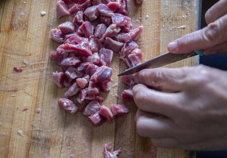Cutting raw meat for cooking stews and barbecue