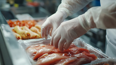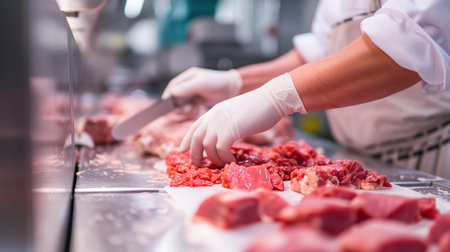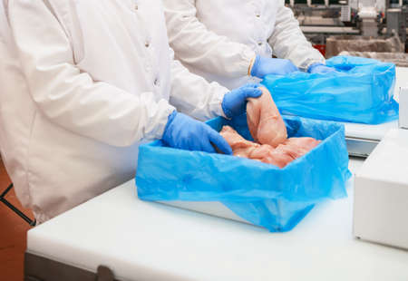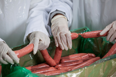modern manufacture of meat, clean, close up, workers hands, selective focus.