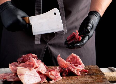chef in black latex chunks cuts into pieces raw rabbit meat on a brown wooden board, cooking on a dark background