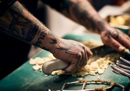 Looking sharp. Closeup of a unrecognisable chefs tattooed hands cutting up vegetables with a knife on a board in a kitchen.