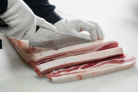 slicing raw meat, bacon, pork, cooking meat. Butchering pork, beef. Cutting fresh meat