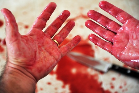 Conceptual image of hands of a married man with a wedding ring are covered in blood