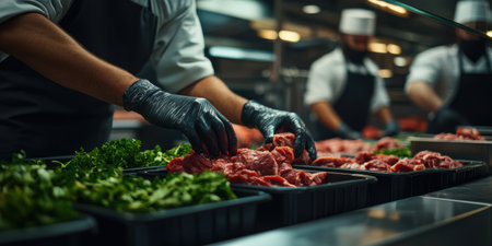In a vibrant kitchen, skilled chefs donning black gloves skillfully arrange fresh meat and vibrant greens into neat trays, showcasing culinary precision and dedication during a busy dinner prep.