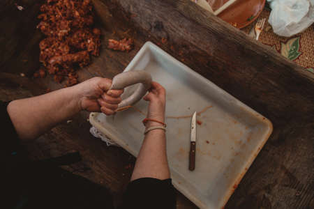 Hands of a professional butcher cutting a piece of raw pork meat with a long knife, on a white plank, at a rural butchery of Serbia. Pork meat is one of the biggest productions in Serbia.
