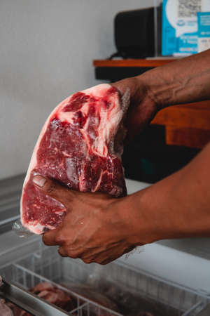 Fine cut of meat in the hands of a butcher taking it out of the freezer