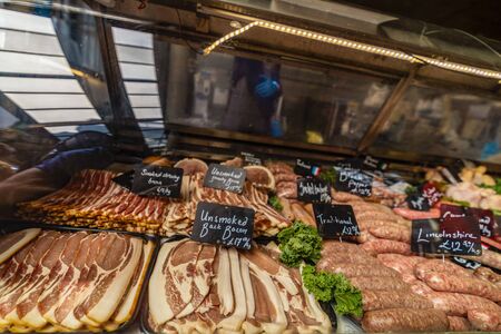 Variety of meats and meat products on sale at a food market stall in London, UK.