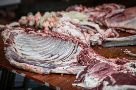 Gross lamb and cow carcass meat and bones with blood on a table of the street food vendors in the Muslim quarter of Xian town, Shaanxi Province, China