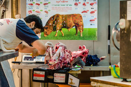 Jerusalem/Israel- August 16, 2016: Butcher butchering a carcass in the Mahane Yehudah Souk market in Jerusalem, Israel