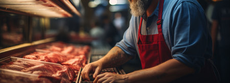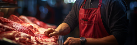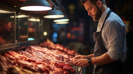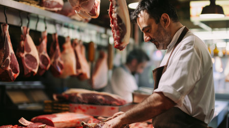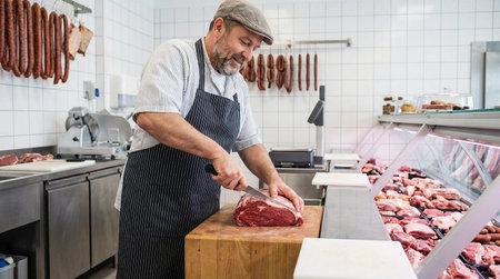 Hardworking male butcher, expertly cutting fresh meat at a traditional butchers counter, surrounded by quality products and a welcoming atmosphere