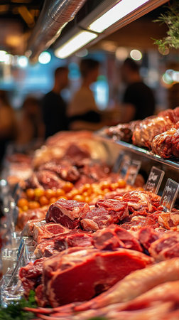 Fresh meat cuts are displayed in a bustling market, with customers examining different options. The vibrant atmosphere showcases various meats and products under soft lighting.