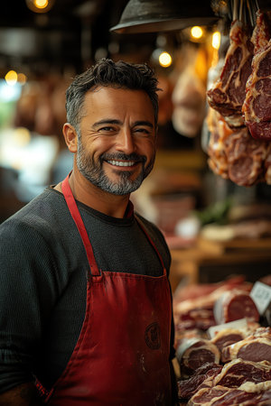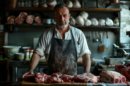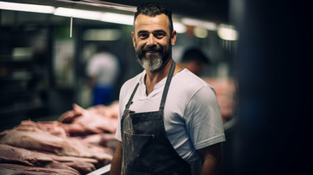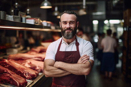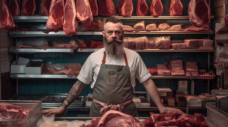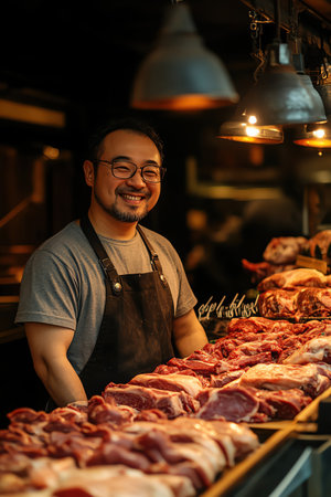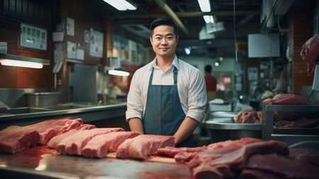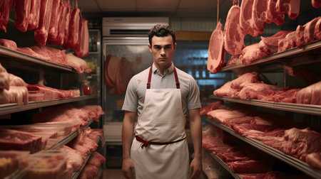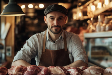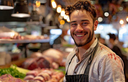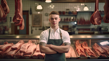 A close-up portrait of a male meat seller wearing a butcher's apron , standing confidently behind a clean, organized counter, exuding professionalism and expertise