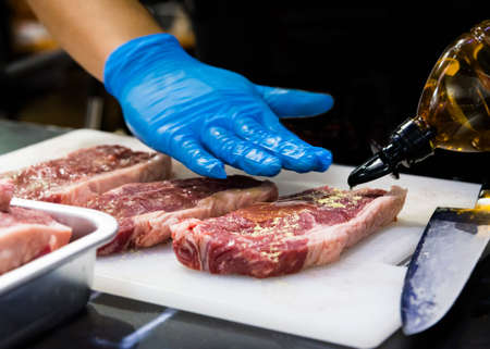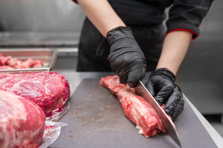 chef cuts raw meat with a knife on a board, Cook cuts raw meat