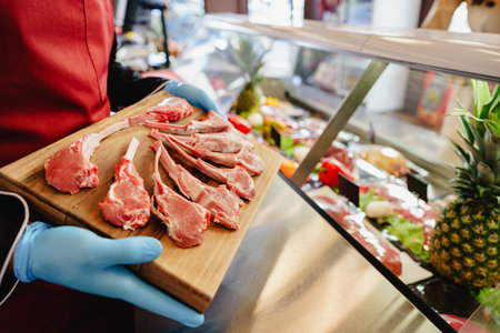 Close up of a butcher setting raw lamb ribs in a butcher shop
