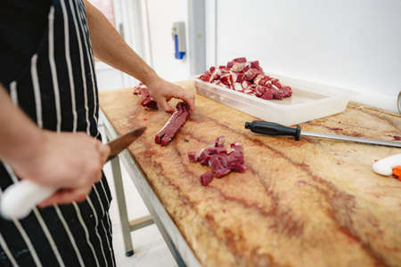 Butcher cutting slices of raw meat on wooden board