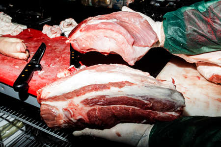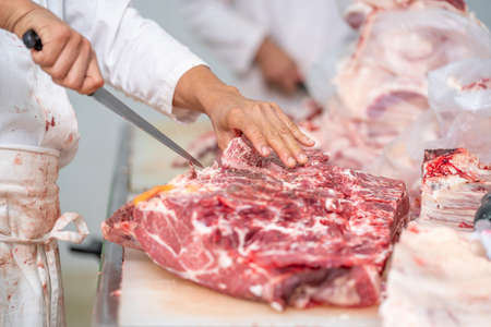 Slaughterhouse. Hands of the workers of the meat shop at work. Butcher cuts pork carcasses with a knife