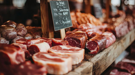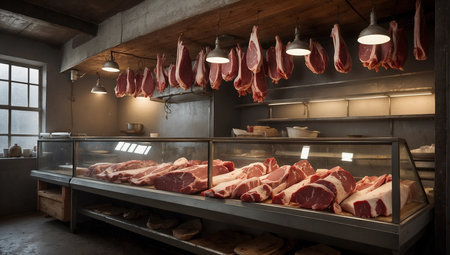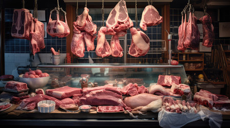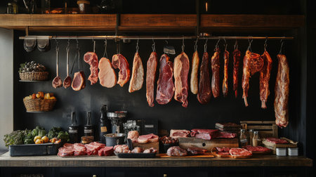 A visually appealing butcher shop featuring a variety of fresh meat cuts hanging on display. The scene includes fresh vegetables and artisanal ingredients, creating a rustic culinary atmosphere.