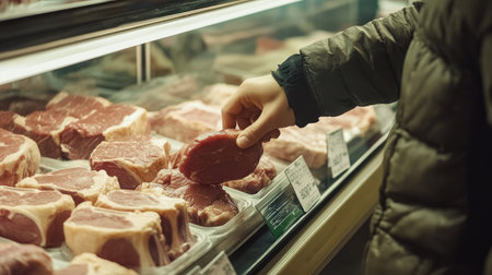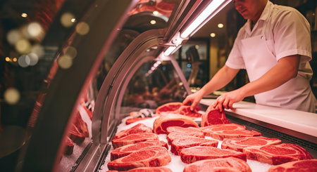 Butcher shop display showcases fresh cuts of meat, with a skilled butcher arranging steaks behind glass, creating an inviting atmosphere for grocery shoppers