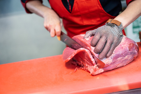 Female butcher cutting fresh meat in a butcher shop with metal safety mesh glove