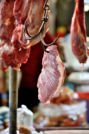 Blur or defocus of Pork meat are hanging on hooks for sale to some customers