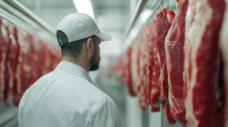 Butcher Inspecting Hanging Meat in Cold Storage Facility.