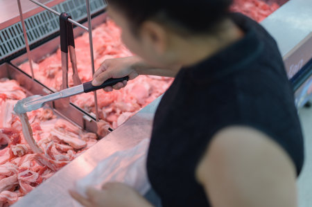 A customer selects fresh pork chops from a grocery store display, showcasing the variety and quality of meat available for purchase for a delicious meal.