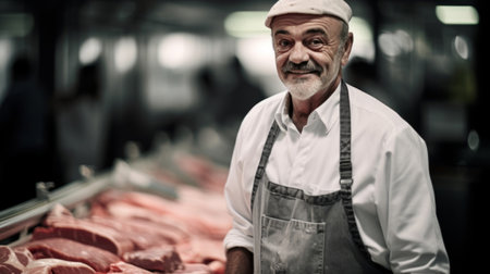 Professional portrait of male butcher wearing apron in shop setting, symbolizing experience, food industry, and traditional craft.