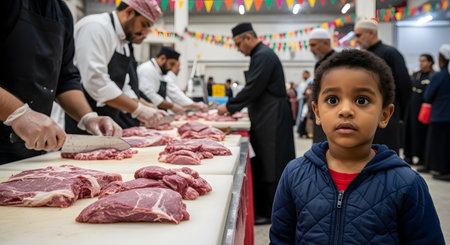 A young boy stands in the foreground looking at the camera, while men in the background butcher large cuts of meat during a community festival. The scene, decorated with colorful flags, depicts the traditions of Eid al-Adha.