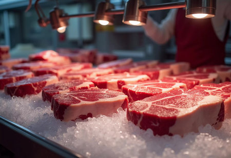 Fresh cuts of well-marbled red meat are neatly arranged in a modern butcher shop, highlighting the quality and variety of available options for chefs and home cooks alike.