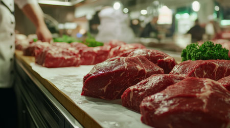 A vibrant kitchen scene featuring fresh cuts of beef on a wooden countertop, highlighting the importance of quality ingredients in food preparation and culinary excellence.