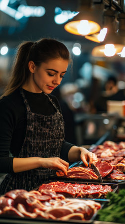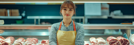 A professional female meat seller works at a clean, organized counter, arranging fresh cuts under bright lights, demonstrating her expertise and friendly service in the trade, banner