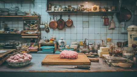 A rustic kitchen filled with fresh ingredients, including meat and vegetables, on a wooden counter. Ideal for cooking enthusiasts and food photography.