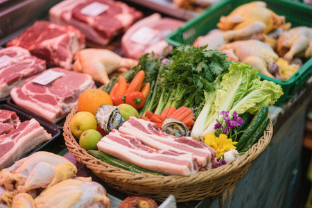 Fresh meat and vegetables in a basket on the counter of a supermarket