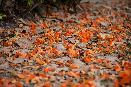 A bunch of orange flower petals are scattered on the ground. The petals are in various shapes and sizes, and they are all different colors. The scene has a somewhat melancholic mood